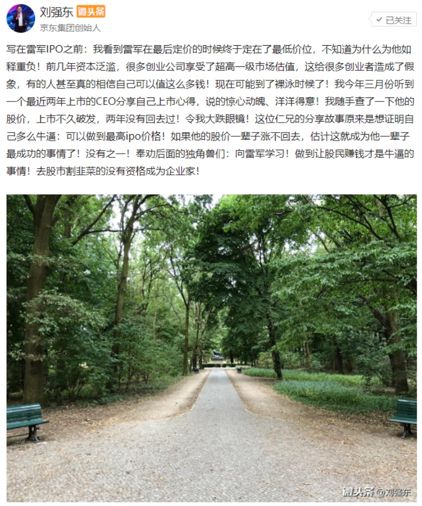 智通财经APP获悉,小米(01810)将于明日(7月9日)正式在港交所挂牌,京东CEO刘强东于今天下午(7月8日)在社交媒体发表评论表示,要向雷军学习,做到让股民赚钱才是牛逼的事情,去股市割韭菜的没有资格成为企业家。