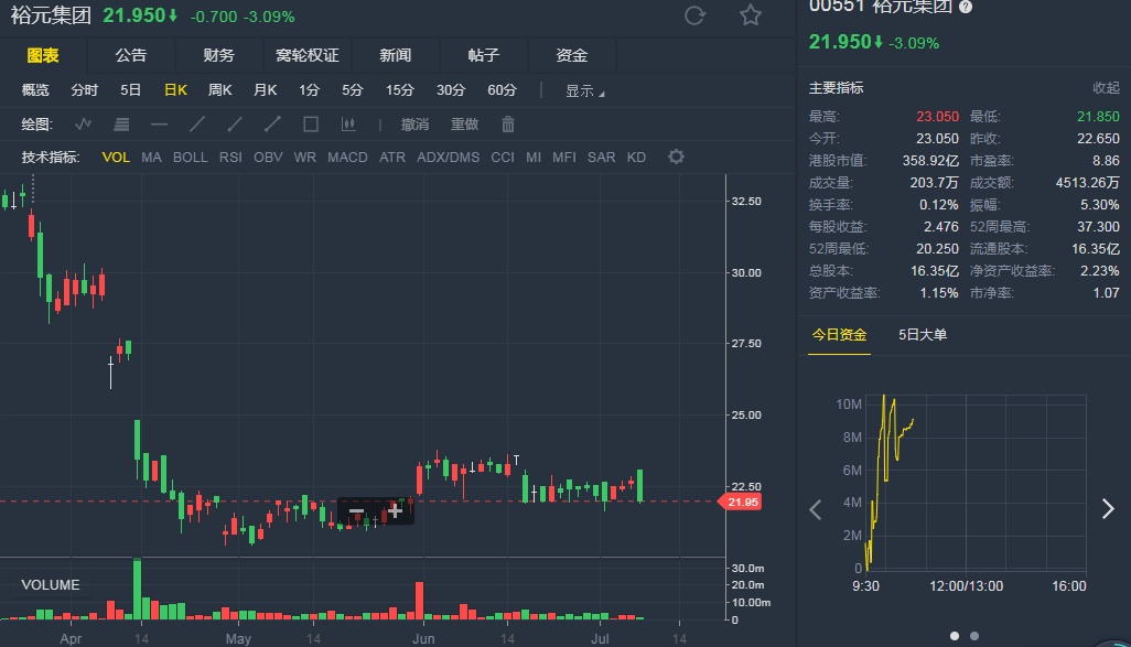 截至7月9日10:44,裕元集团跌3.09%,报21.95港元。