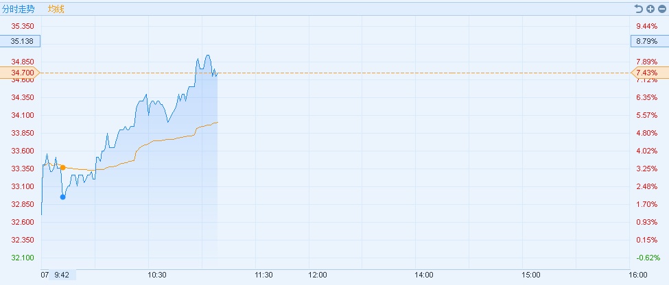 智通财经APP获悉,白云山(00874)顺市大涨,截至11时08分,涨7.43%,报价34.7港元,成交额8712.52万。