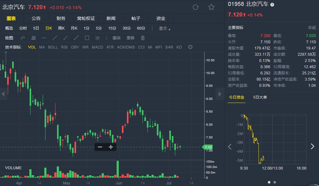截至7月9日11:18,北汽涨0.14%,报7.12港元。