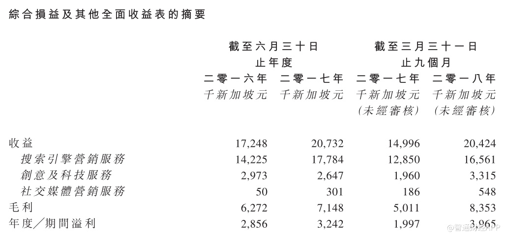 公司的业务模式专注于深入了解客户的垂直行业领域;了解最新市场供应品的情况;以及编制清晰透明的报告,以便客户可充分知悉营销活动的结果。三个在线营销服务类别乃相互关连且相辅相成。根据客户的需求及喜好定制服务,并可提供单一类型的在线营销服务或营销服务组合。根据弗若斯特沙利文报告,公司2017财政年度在新加坡的所有在线营销服务供应商中排名第一,在线营销行业的市场份额约为6.4%。