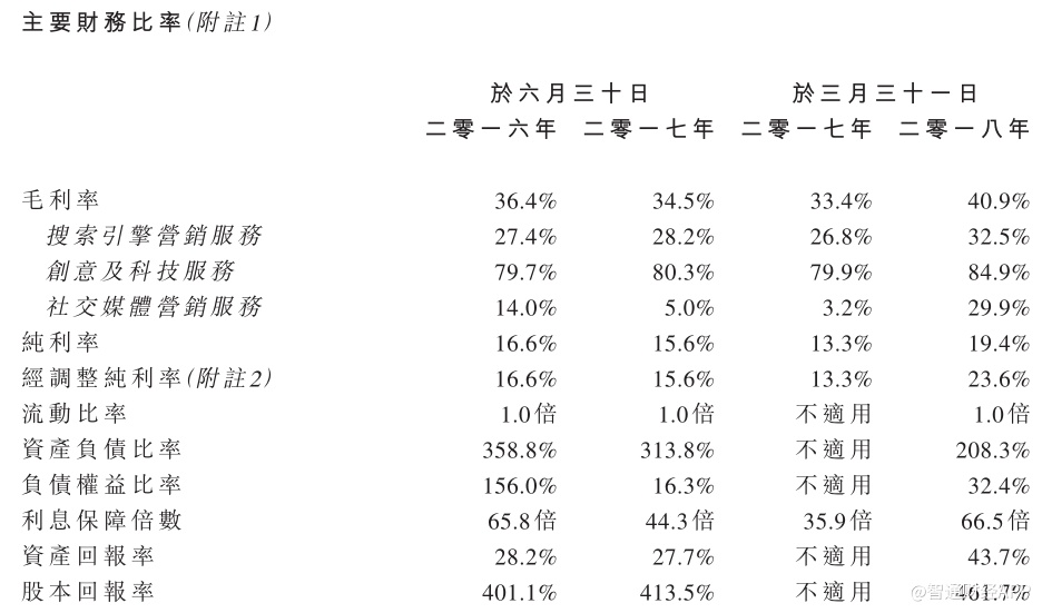 公司的毛利率由2016年财政年度约36.4%下降至2017年财政年度约34.5%,主要由于扩大团队而导致社交媒体营销服务的员工成本增加。由于需要时间以熟悉社交媒体平台的产品,公司社交媒体营销服务方面的运营效率之后得以改善,有关情况可从社交媒体营销服务的毛利率由2017年财政年度九个月约3.2%大幅增加至2018年财政年度九个月约29.9%中反映。与2016年财政年度相比,搜索引擎营销服务的毛利率在2017年财政年度保持相对稳定,由2017年财政年度九个月的约26.8%增加至2018年财政年度九个月的约32.5%,是公司同期整体毛利率上升的主要动力。