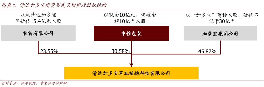 增资协议:中粮包装对清远加多宝增资人民币 20 亿元(10 亿元以现金方式支付,10 亿元以公司生产的两片饮料罐出资),占 30.58%股份,加多宝方面将持有的加多宝商标作为增资,作价 30 亿元,占目标公司 45.87%股份。各方将共同打造集加多宝品牌、浓缩液、供销体系为一体的综合运营平台。