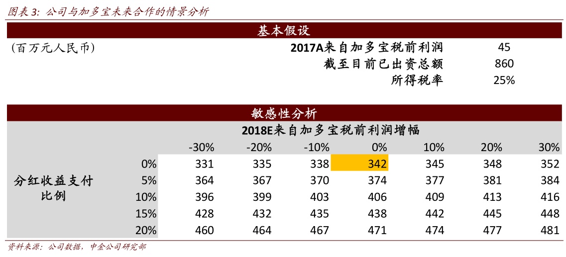 悲观假设下:双方关系结束,中粮包装来自于加多宝的利润为0。我们以估算的2017年4500 万加多宝税前利润为基数,2018 年约损失-4,500 万元税前利润。