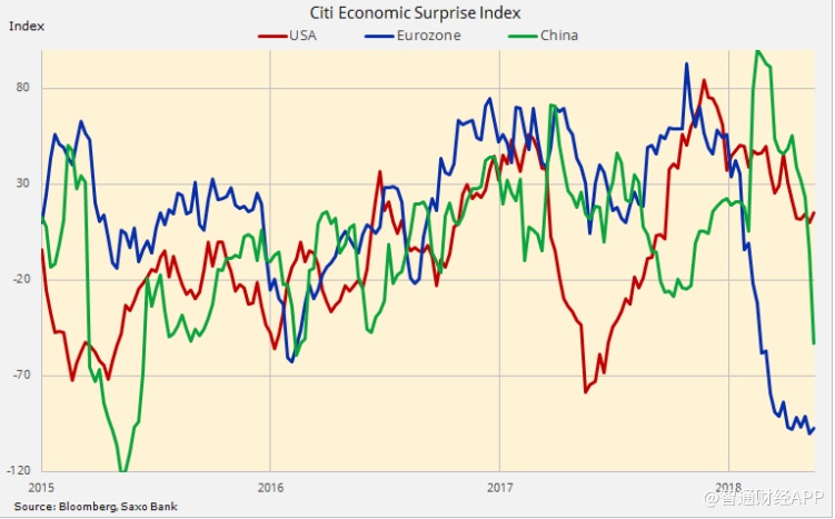 花旗经济意外指数衡量经济数据相对于市场预期的意外表现,近期该指数显示市场主要经济体的经济数据走软。