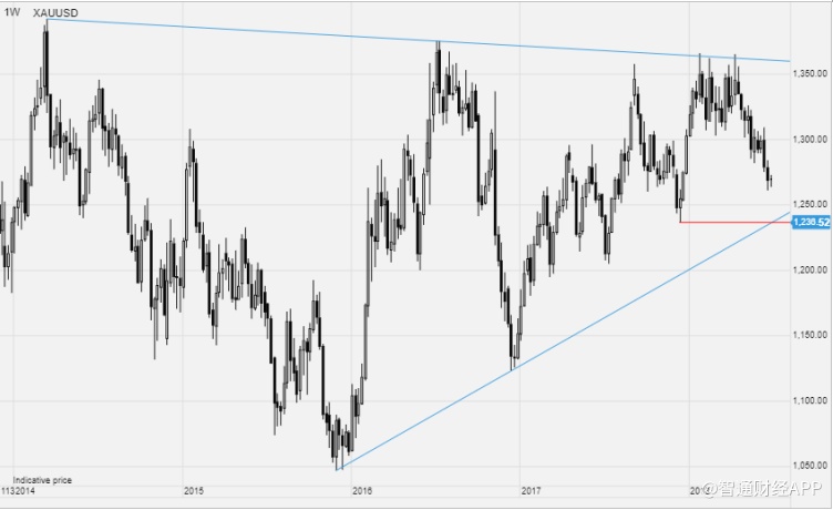 盛宝银行预计,金价在触及长期支撑位约1236美元/盎司(去年12月触及的前低也与2015年12月触及的低点形成趋势线)前,将建立阶段性支撑位。