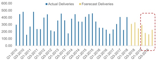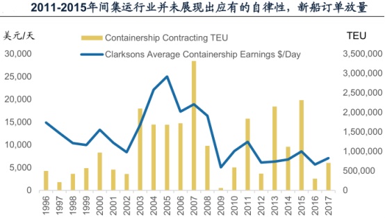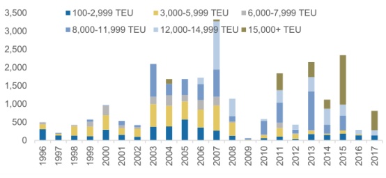 由于存量订单大多数签订于2015年及之前,船只交付大部分会在2019年之前完成。而2017年及之后新增的订单以15000TEU以上的大型集运船为主,除了少部分可以于19年交付外,大多需要到2020年之后才能逐渐投入使用,这使得2019年的新船交付会形成一个确定性的低谷,也为之后运价的抬升提供了条件。