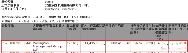 威灵顿减持海螺水泥(00914)1444万股 涉资5.97亿元
