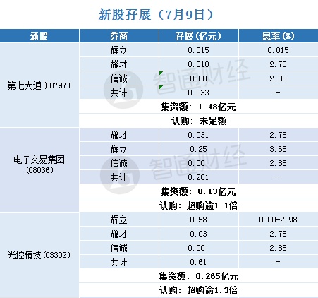 截至7月9日,正在招股的新股中,耀才、信诚、辉立3家券商为生产半导体行业的设备、机械、子系统、精密工具及零部件的合约制造商光控精技(03302)借出孖展金0.265亿港元,超购逾1.3倍;为为主力提供金融软件方案服务的金融科技方案供应商电子交易集团(08036)借出孖展金额0.13亿港元,超购逾1.1倍;网络游戏开发商及营运商第七大道(00797)认购尚未足额。具体情况如下: