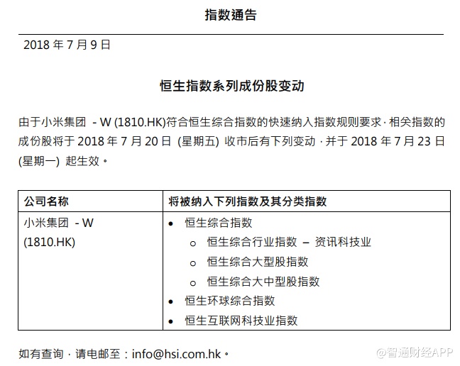 智通财经APP获悉,小米上市首日7月9日,恒指公司发布通告,正式确认小米(01810)将于7月23日纳入恒生指数消息。成份股将于7月20日收市后纳入多个指数,并于7月23日起生效。