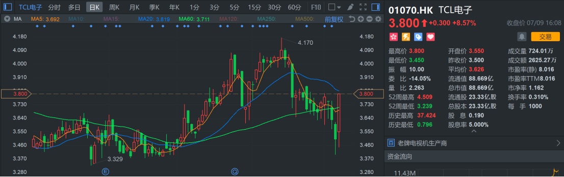 值得一提的是,伴随这大股东的增持,TCL电子股价在7月9日累计上涨8.57%,成交724万股,成交金额达到2625.27万港元创近期新高。