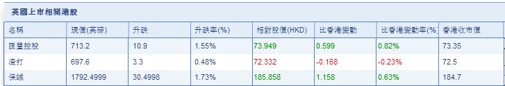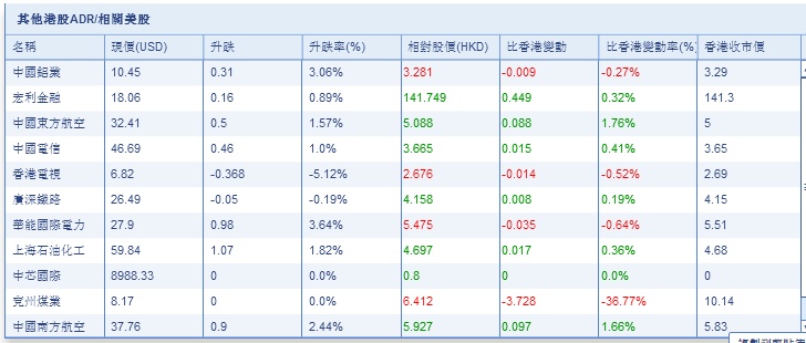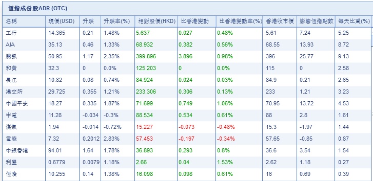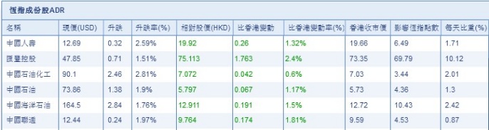 智通财经APP获悉,截至7月6日美股收盘,港股ADR指数全日做好,按比例计算,收报28962.65点,升274.15点或0.96%。大型蓝筹全线靠稳,汇丰控股收报73.949元,较港收市升0.599元;腾讯控股收报399.896元,较港收市升3.896元。内银内险股上涨,香港公用事业股微跌。