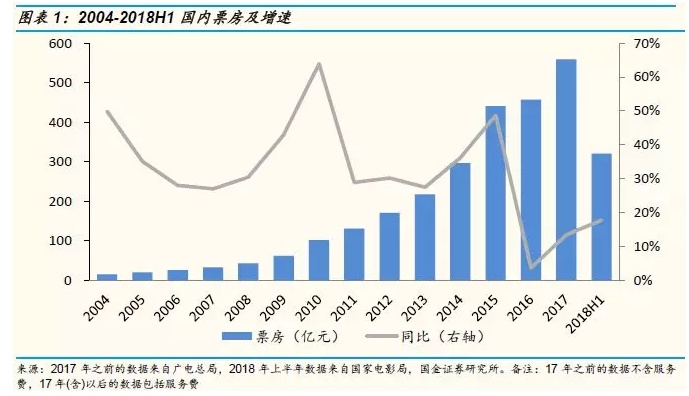 2017年的总票房是559亿元(含服务费),如果按照乐观情况,则4年以后(2021年)票房接近翻番,如果按照中性情况,则5年以后(2022年)票房接近翻番。