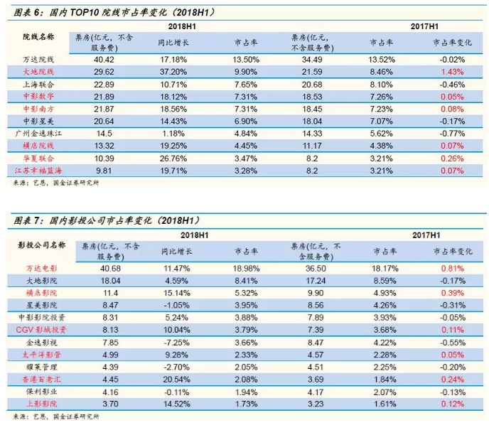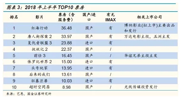 2018年上半年票房增长17.82%,国产电影同比增长80%,占比近六成:电影行业持续复苏,国产片上半年票房TOP10的电影平均豆瓣评分达到6.4分,平均票房达到14.77亿元,远高于去年同期水平。在上半年总票房TOP10的电影中,万达电影主投的《唐人街探案2》排名第2、华谊兄弟主投主发的《前任3》排名第5,光线传媒投资发行的《超时空同居》排名第10,另外有6部电影有IMAX版本。