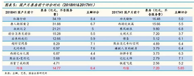 国产电影口碑与票房双升印证了国内电影市场进入“口碑时代”的市场风向。对比今年上半年国产电影票房前十与去年同期情况,口碑票房进步显著。剔除《厉害了我的国》没有豆瓣评分的影响,票房前十电影平均豆瓣评分达到了6.38,去年同期为5.85,平均票房达到14.77亿元,去年同期为7.2亿元,进步惊人。十部国产片中仅《西游记女儿国》评分低于5分,7分以上电影也是有3部之多,其中《红海行动》评分高达8.4分,票房口碑双丰收,被称为达到了好莱坞工业水准的战争题材片。