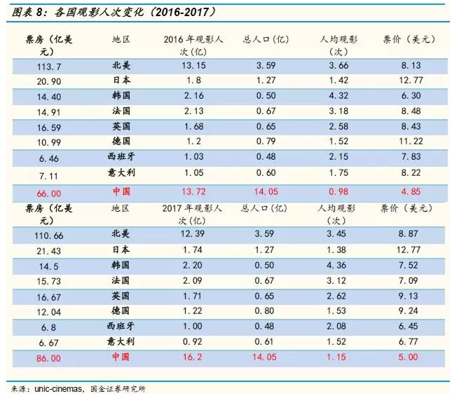 人均观影人次看中国的票房仍有巨大空间。总票房=票价*总观影人次,由于票价变化较小(北美地区近几年票价涨幅基本跑不赢CPI涨幅),主要的变量在于总的观影人次。从发达国家的数据来看,人均观影次数在4次左右会达到瓶颈期(17年北美是3.45次,韩国是4.36次),2017年中国总的观影人次是16.2次,按照全人口算人均观影次数是1.165次,按照城镇人口算是1.99次(假设农村人口都不看电影),仍有比较大的提升空间。