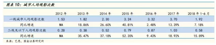 总的观影人次分成一二线城市来看,17年一线城市的人均观影次数达到3.75次,已经接近发达国家的水平, 17年二线及以下的人均观影次数达到1.03次,有比较大的提升空间。今年上半年一线城市的人均观影次数同比增长7.18%,二线及以下城市的人均观影次数同比增长15.89%,主要的增长动力来自于二线及以下城市。