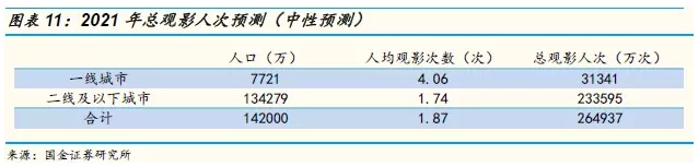 在乐观和中性情况下,2021年的城镇人口人均观影次数分别为3.2和3.0次,尚未到达瓶颈期,只是增速会放缓。