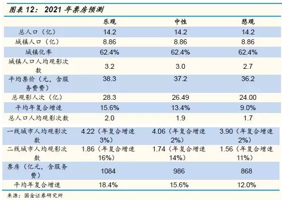 我们做了3种情景假设(按照一二线的人均观影人次的复合增速判断未来的情况),中性情况下未来4年的年票房增长为15.6%左右,票房达到986亿元,乐观情况下未来4年的年票房增长为18.4%左右,票房达到1084亿元,悲观情况下未来4年的年票房增长12.0%左右,达到868亿元。