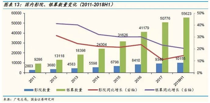 2012-2018H1大部分的年份(除了2014和2015年)银幕增速高于票房增速,造成了单银幕产出持续下滑,我们预计今年将迎来向上的拐点。从下面的图表可以看出,银幕增速逐年放缓,17年银幕增速23%,18年上半年降至20.56%,我们预计全年银幕增速可能低于20%。今年上半年票房增长17.8%,由于暑期档的票房表现强劲,我们预计全年票房增速20%以上,预期今年单屏产出增速将实现反转,增速约1.7%以上。