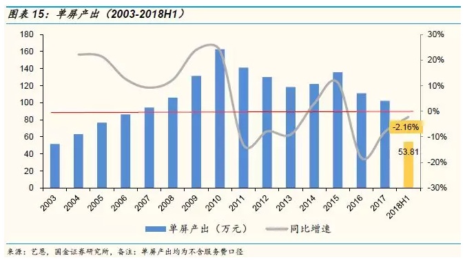 院线公司票房收入的增长依赖于整体电影票房的增长。而院线公司的盈利能力,取决于毛利率和净利率的变化,过去几年院线公司由于快速扩张,单银幕产出持续下滑造成了票房业务的毛利率下降,但是我们认为今年单银幕产出会止跌回升,成为院线公司盈利能力改善的重要拐点。