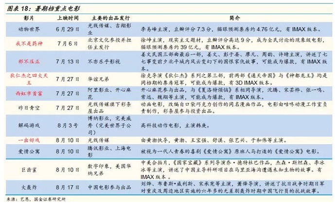 除了现象级电影《我不是药神》,其他还有国产大片值得期待,我们认为有爆款潜质的电影主要有7月13日上映的姜文导演的《邪不压正》,7月27日上映的华谊兄弟主要出品的系列电影《狄仁杰之四大天王》以及开心麻花参投的《西虹市首富》,以及8月10号上映的光线传媒投资发行,黄渤导演的《一出好戏》。此外光线旗下彩条屋出品的动画片《昨日青空》也有成为动画黑马的可能性。