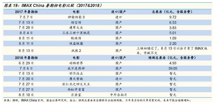 重点关注港股IMAX China(019),由于去年暑期档的票房基数低(去年暑期一开始错过了《战狼2》,后来才加了转制),今年暑期档有《动物世界》、《我不是药神》、《邪不压正》、《狄仁杰之四大天王》、《西虹市首富》、《巨齿鲨》等多部电影有IMAX版本,预计暑期IMAX票房同比出现高增长。