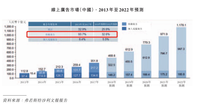 据智通财经APP了解,中国的线上广告市场按广告开支计算,由2013年的1128亿元增加至2017年的3518亿元,年复合增长率为32.9%。根据沙利文报告,中国的线上广告市场预计到2022年将达11781亿元,年复合增长率为25.9%,远高于线下广告市场的2.8%。值得一提的是,中国线上广告市场主要受移动广告市场带动,后者市场规模由2013年的154亿元戏剧性的增加至2017年的2172亿元,年复合增长率高达93.7%。未来5年仍将高速增长。这种增长其本质是人们对智能手机的使用及依赖已经形成,而智能手机的互联网时代中,主要玩家从传统的BAT又新加入的掌握硬件和手机操作系统的手机厂商,这种依托手机厂商且而基于自主研发的、具备人工智能技术的DAPG平台生成移动广告营销的玩咖欢聚,业务发展潜力巨大,该公司过去三年业绩增长迅猛就是最好的证明。