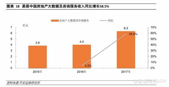 公司房地产大数据及资信服务主要依据项目具体情况收取费用,单项目的服务费通常为固定值。2015-2017年房地产大数据及咨询服务分别实现收入3.8、4.0、6.3亿元,2017年增速较2016年大幅提升,主要受益于测评及排名服务的增长和交易咨询服务的推出。