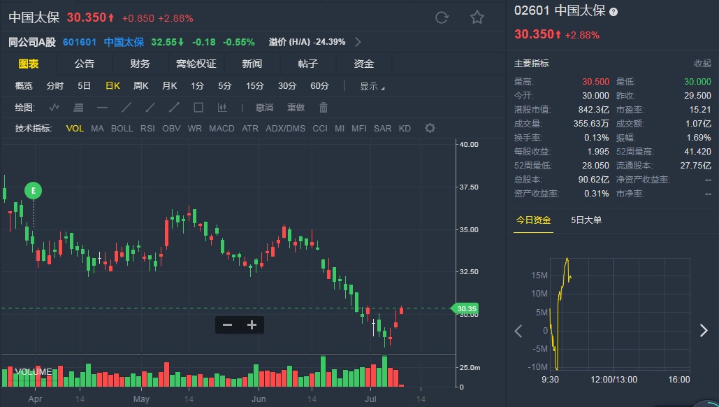 截至7月10日上午10:22,中国太保涨2.88%,报30.35港元。