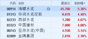 智通财经APP获悉,水泥股全线走高,海螺水泥(00914)领涨水泥板块,截至10时35分,海螺水泥(00914)涨5.3%,华润水泥控股(01313)、西部水泥(02233)、中国建材(03323)涨超4%,亚洲水泥(00743)涨3.14%,金隅集团(02009)涨2.18%。