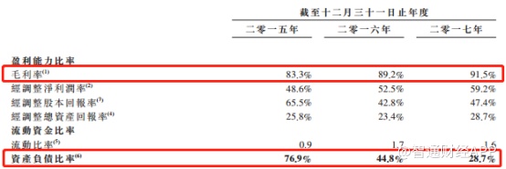 并且公司在2015-2017年毛利率从83.3%提高至91.5%,资产负债率从76.9%大幅降至28.7%。