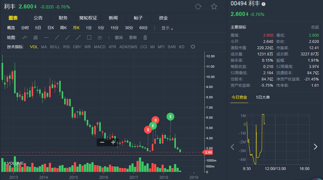 截至7月10日11:07,利丰跌0.76%,报2.6港元。