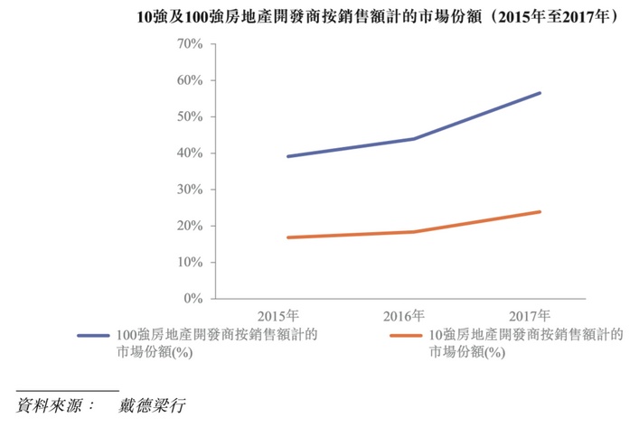中国房地产市场整合加速。随着本轮房地产调控进一步深化(融资渠道收缩、招拍挂资质门槛提高、限价等手段),龙头房企份额提升明显。2017年,以销售金额计算的10强、20强、50强、100强房地产企业市场份额分别为24.05%、32.21%、45.29%和55.24%,分别较上年增长5.34、7.38、12.20和15.49 pct,各梯队市场份额近年均基本呈现上升趋势,且呈现销售持续向龙头企业集中的态势。根据戴德梁行报告,预计2020年,以销售额计中国百强房地产开发商的市场份额将增长到65%左右。