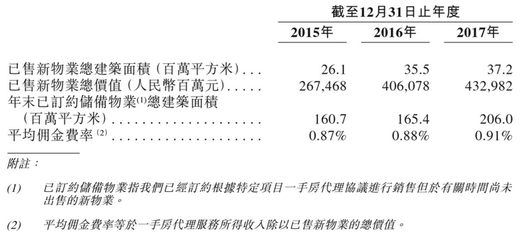 公司85%营收来自一手房代理,而这部分营收取决于已售新物业总价值和平均佣金率。由于平均佣金率基本保持稳定(2015-2017:0.88%/0.89%/0.91%),且由于未来提价空间不大的情况下,该业务增长主要还是受益于出售的新物业总价值增加。进一步地,已售新物业总价值又可拆分为已售新物业的合计总建筑面积及平均售价,由下表可以看出,在平均售价涨幅平稳的情况下,总建筑面积是核心驱动因素。也就是说,客户资源变动会对公司业绩影响较大。
