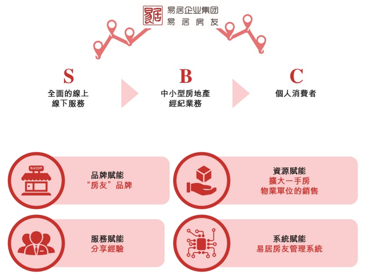 二手房经纪服务主要包括向个别客户及二手房交易有关的经纪公司提供交易及相关增值服务。目前市场存在三种业务模式:自营店、加盟店及公司在二手房市场开创的一种轻资产的"S2B2C"业务模式。该模式向中小型经纪司提供房友品牌下的全面服务(含品牌、服务、资源、系统在内的线上线下服务)从而帮助其更好地服务于其个人客户。