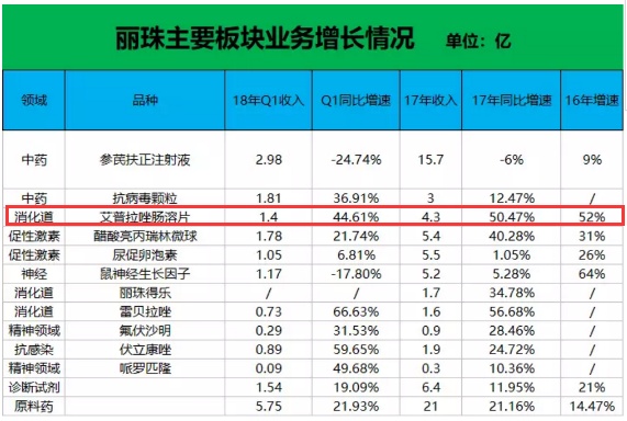 就以奥美拉唑镁肠溶片来说,港股卖的最好的是丽珠医药(01513)。2017年,丽珠消化道领域的重点品种艾普拉唑肠溶片实现销售收入高达4.28亿元,同比增长50.47%;一季度再次实现44.61%的增速。