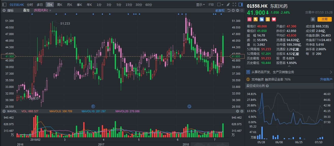 7月9日晚间,不久前才获中国证监会批准转让控股权的东阳光药(01558)便率先对外发布了业绩盈喜。受利好消息影响,该股早盘高开,最高冲至48港元,一度让投资者看到了“解套”的希望,可奈何最终被大市所累。截至发稿,出现放量式下跌,约2.5个点。