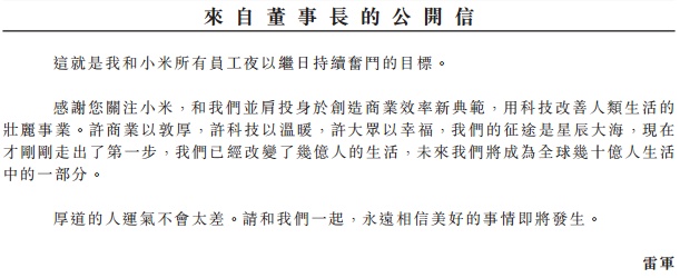 这似乎也应了小米董事长雷军在公开信中最后一句话所言:“厚道的人运气不会太差。请和我们一起,永远相信美好的事情即将发生。”