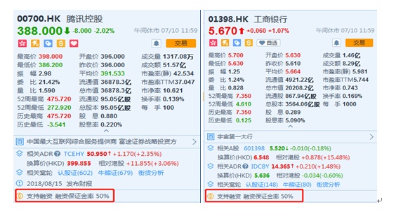 智通财经APP通过查阅富途证券发现,腾讯控股(00700)及汇丰控股(00005)的融资质押率都未超过50%,哪怕是号称宇宙第一大行的工商银行(01398),其融资质押率也只有50%。