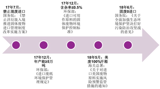 2017 年以来,我国陆续推出关于废纸进口的管控政策,包括禁止进口未经分拣的废纸(限制混废进口)、进口废纸企业规模要求 5 万吨/年以上、进口废纸含杂率上限标准降为 0.5%、对美废 100%开箱检验等,从企业资质、外废标准与质量审查等各方面管控废纸进口,全面体现外废进口严格管控将是长期趋势。