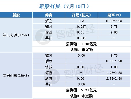 截至7月10日,正在招股的新股中,耀才、信诚、辉立、海通、敦沛5家券商为房地产交易服务提供商易居中国(02048)借出孖展金5.71亿港元,认购尚未足额;辉立、耀才、信诚3家券商为网络游戏开发商及营运商第七大道(00797)借出孖展金1.48亿元,认购尚未足额。具体情况如下: