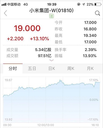 7月10日,小米上市第二日高开1.19%,此后一路向上,在收盘最后5分钟,还上演了V反弹,截止收盘,小米报19港元,报13.1%。