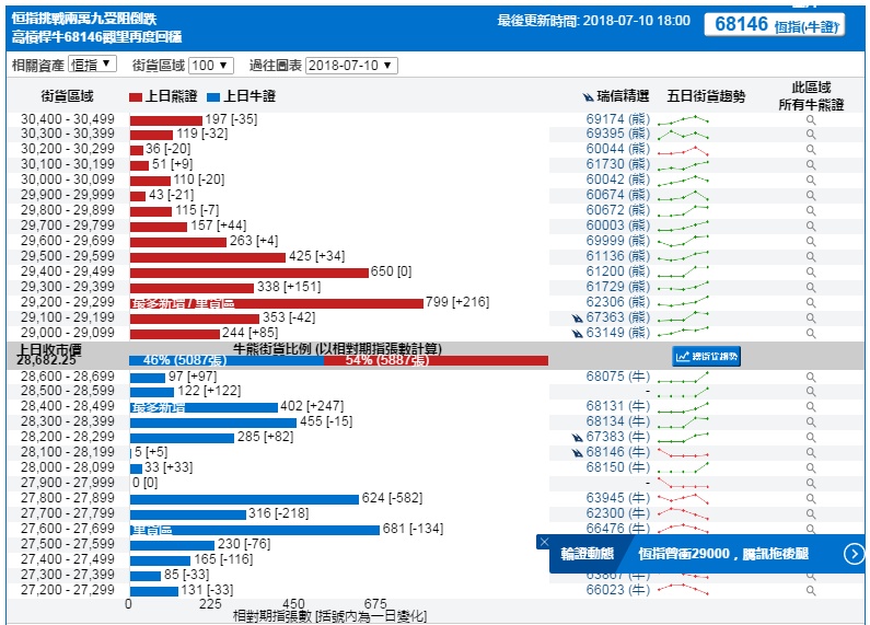 智通财经APP获悉,截至7月10日,恒指最新的牛熊街货比例为46:54。从瑞信恒指牛熊证街货分布图中得到的数据显示,熊证街货重货区在29200-29299区间,此区间最新的熊证数量为799张,比上一交易日增加151张,最多新增也落在这一区间。牛证中重货区在27600-27699区间,该区间最新牛证数量为681张,比上一交易日减少134张;最多新增落在28400-28499这一区间,新增247张。