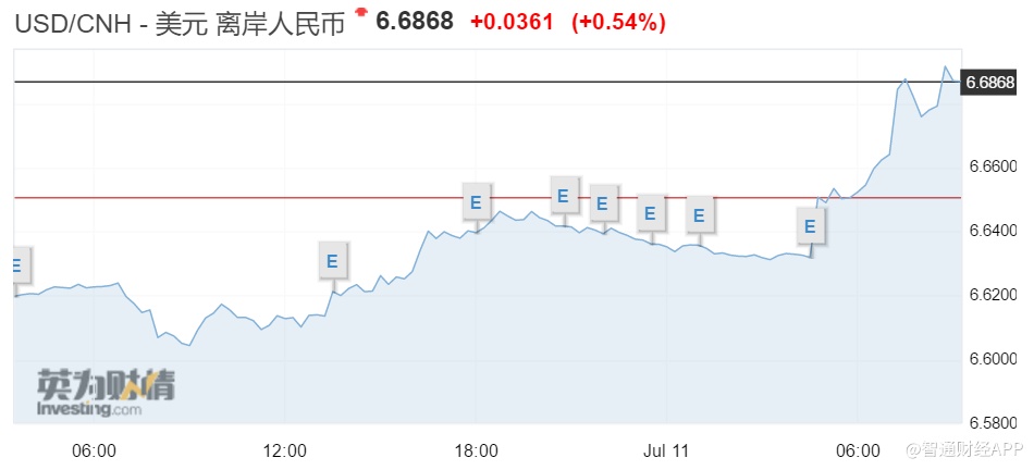 智通财经APP获悉,人民币兑美元中间价报6.6234,上一交易日中间价6.6259。上一交易日官方收盘价报6.6230,上一交易日夜盘收盘报6.6374。离岸人民币兑美元刚一度跌破6.69关口,日内一度跌约400点。在岸人民币兑美元开盘跌破6.67关口,报6.6694,较昨日夜盘收盘跌超300点。