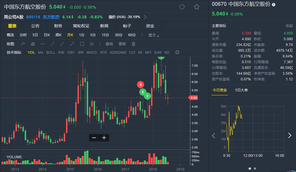 截至7月11日11:01,东航跌0.98%,报5.04港元。