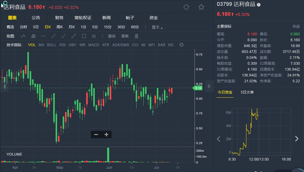 截至7月11日12:02,达利食品涨0.32%,报6.18港元。