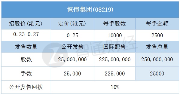 智通财经APP获悉,7月11日,恒伟集团(08219)配售结束。本次配售招股价区间为0.23-0.27港元,最终定价0.25港元,每手2500港元。