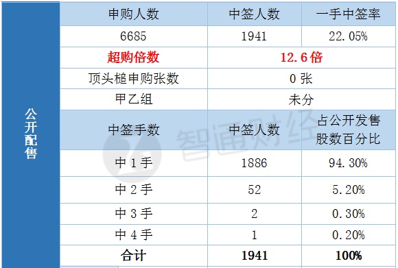 其中,公开配售H股申购人数6685,一手中签率22.05%,超购倍数12.6倍。
