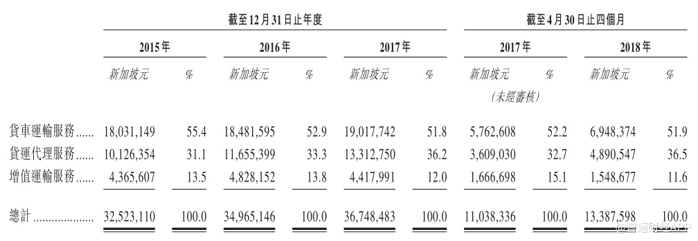 财务方面,据招股书显示,截至2017年12月31日止3个年度公司的收入总额保持相对稳定,分别约为0.325亿(新加坡元,下同)、0.35亿元及0.367亿元。从截至2017年4月30日止4个月约0.11亿元上升约21.8%至截至2018年4月30日止4个月约0.134亿元,主要由于货车运输服务增加约0.12亿元,及货运代理服务增加约0.13亿元。